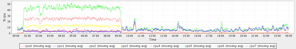 avg(cpu0) = 1.61 avg(cpu1) = 0.13 avg(cpu2) = 0.24 avg(cpu3) = 0.13 avg(cpu4) = 0.13 avg(cpu5) = 0.09 avg(cpu6) = 0.16 avg(cpu7) = 0.11