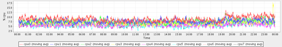 avg(cpu0) = 8.86 avg(cpu1) = 7.61 avg(cpu2) = 7.67 avg(cpu3) = 6.97 avg(cpu4) = 5.75 avg(cpu5) = 5.67 avg(cpu6) = 6.26 avg(cpu7) = 6.09