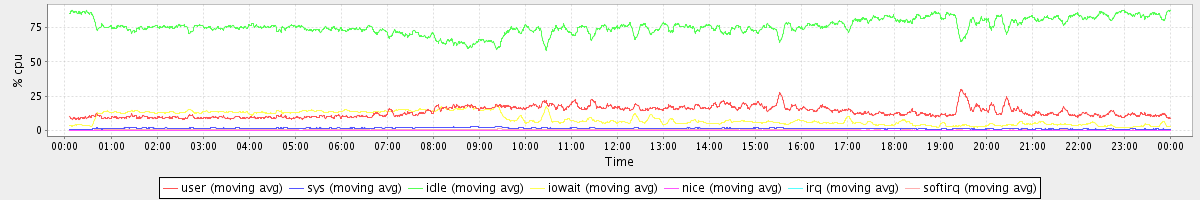 avg(user) = 13.54 avg(sys) = 1.48 avg(idle) = 75.93 avg(iowait) = 8.55 avg(nice) = 0.00 avg(irq) = 0.05 avg(softirq) = 0.45