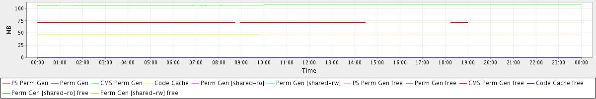 avg(PS Perm Gen) = 0.00 avg(Perm Gen) = 0.00 avg(CMS Perm Gen) = 106.88 avg(Code Cache) = 46.68 avg(Perm Gen [shared-ro]) = 0.00 avg(Perm Gen [shared-rw]) = 0.00 avg(PS Perm Gen free) = 0.00 avg(Perm Gen free) = 0.00 avg(CMS Perm Gen free) = 71.70 avg(Code Cache free) = 1.13 avg(Perm Gen [shared-ro] free) = 0.00 avg(Perm Gen [shared-rw] free) = 0.00