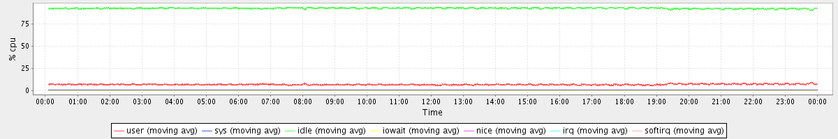 avg(user) = 6.83 avg(sys) = 0.52 avg(idle) = 92.60 avg(iowait) = 0.01 avg(nice) = 0.00 avg(irq) = 0.00 avg(softirq) = 0.01