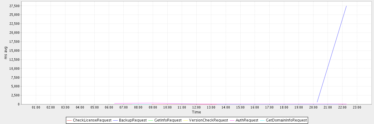 avg(CheckLicenseRequest) = 2.00 avg(BackupRequest) = 13998.00 avg(GetInfoRequest) = 12.67 avg(VersionCheckRequest) = 301.00 avg(AuthRequest) = 128.25 avg(GetDomainInfoRequest) = 2.08