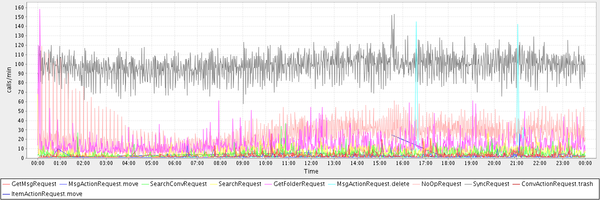 max(GetMsgRequest) = 26.00 max(MsgActionRequest.move) = 26.00 max(SearchConvRequest) = 37.00 max(SearchRequest) = 68.00 max(GetFolderRequest) = 158.00 max(MsgActionRequest.delete) = 145.00 max(NoOpRequest) = 119.00 max(SyncRequest) = 153.00 max(ConvActionRequest.trash) = 27.00 max(ItemActionRequest.move) = 25.00