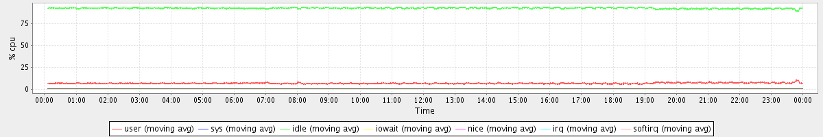 avg(user) = 6.83 avg(sys) = 0.53 avg(idle) = 92.59 avg(iowait) = 0.01 avg(nice) = 0.00 avg(irq) = 0.00 avg(softirq) = 0.01