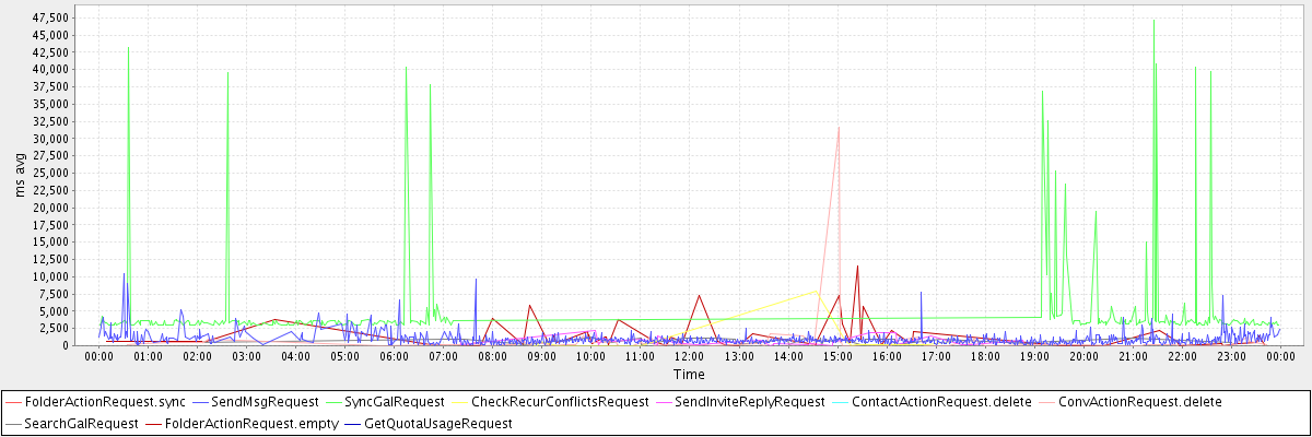 avg(FolderActionRequest.sync) = 14635.00 avg(SendMsgRequest) = 913.93 avg(SyncGalRequest) = 4891.30 avg(CheckRecurConflictsRequest) = 713.20 avg(SendInviteReplyRequest) = 666.29 avg(ContactActionRequest.delete) = 760.00 avg(ConvActionRequest.delete) = 744.01 avg(SearchGalRequest) = 686.10 avg(FolderActionRequest.empty) = 1448.69 avg(GetQuotaUsageRequest) = 1151.00