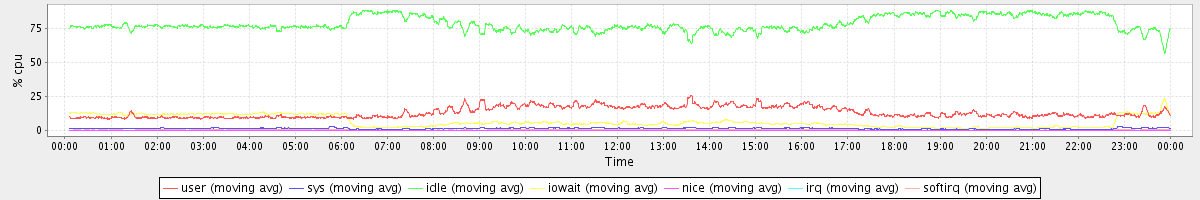 avg(user) = 13.29 avg(sys) = 1.43 avg(idle) = 78.33 avg(iowait) = 6.52 avg(nice) = 0.00 avg(irq) = 0.06 avg(softirq) = 0.37