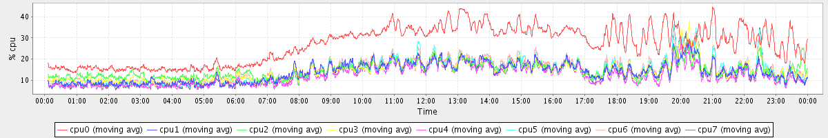 avg(cpu0) = 26.86 avg(cpu1) = 13.73 avg(cpu2) = 14.78 avg(cpu3) = 14.39 avg(cpu4) = 12.22 avg(cpu5) = 14.41 avg(cpu6) = 15.14 avg(cpu7) = 13.49