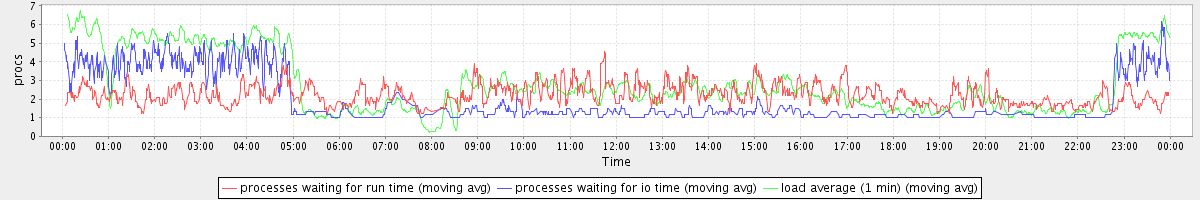 avg(processes waiting for run time) = 1.46 avg(processes waiting for io time) = 1.21 avg(load average (1 min)) = 2.82