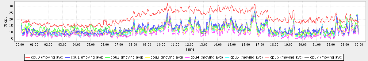 avg(cpu0) = 21.25 avg(cpu1) = 12.64 avg(cpu2) = 12.82 avg(cpu3) = 11.80 avg(cpu4) = 9.44 avg(cpu5) = 11.21 avg(cpu6) = 12.55 avg(cpu7) = 11.31