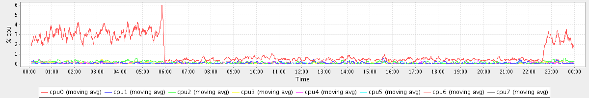 avg(cpu0) = 1.22 avg(cpu1) = 0.09 avg(cpu2) = 0.15 avg(cpu3) = 0.08 avg(cpu4) = 0.05 avg(cpu5) = 0.06 avg(cpu6) = 0.10 avg(cpu7) = 0.05