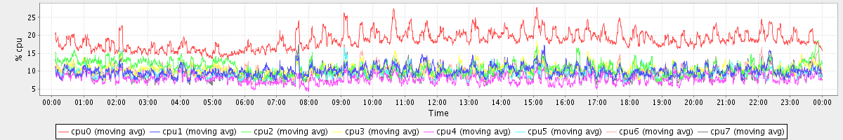 avg(cpu0) = 18.67 avg(cpu1) = 10.04 avg(cpu2) = 10.96 avg(cpu3) = 10.61 avg(cpu4) = 7.92 avg(cpu5) = 9.74 avg(cpu6) = 10.25 avg(cpu7) = 9.36