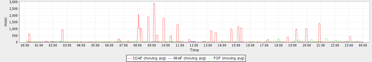 avg(SendInviteReplyRequest) = 199.43 avg(SetAppointmentRequest) = 435.23 avg(AutoCompleteRequest) = 484.83 avg(SendMsgRequest) = 852.51 avg(DeleteAccountRequest) = 97549.00 avg(ConvActionRequest.delete) = 490.52 avg(FolderActionRequest.empty) = 620.80 avg(SyncGalRequest) = 3984.04 avg(BackupRequest) = 847.50 avg(GetQuotaUsageRequest) = 2207.00