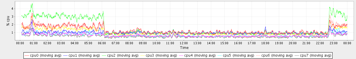 avg(cpu0) = 1.18 avg(cpu1) = 0.09 avg(cpu2) = 0.16 avg(cpu3) = 0.07 avg(cpu4) = 0.04 avg(cpu5) = 0.06 avg(cpu6) = 0.08 avg(cpu7) = 0.05