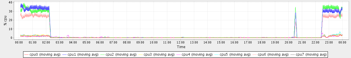 avg(cpu0) = 0.35 avg(cpu1) = 5.30 avg(cpu2) = 5.43 avg(cpu3) = 0.51 avg(cpu4) = 0.68 avg(cpu5) = 0.43 avg(cpu6) = 4.00 avg(cpu7) = 0.45