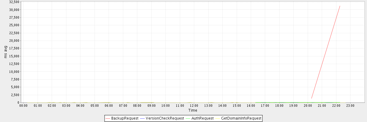 avg(BackupRequest) = 16285.00 avg(VersionCheckRequest) = 689.00 avg(AuthRequest) = 47.33 avg(GetDomainInfoRequest) = 9.73