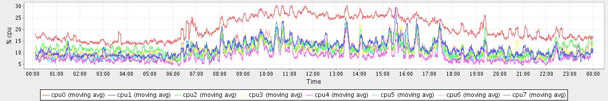 avg(cpu0) = 20.52 avg(cpu1) = 11.89 avg(cpu2) = 11.89 avg(cpu3) = 10.96 avg(cpu4) = 8.52 avg(cpu5) = 10.34 avg(cpu6) = 11.53 avg(cpu7) = 10.29