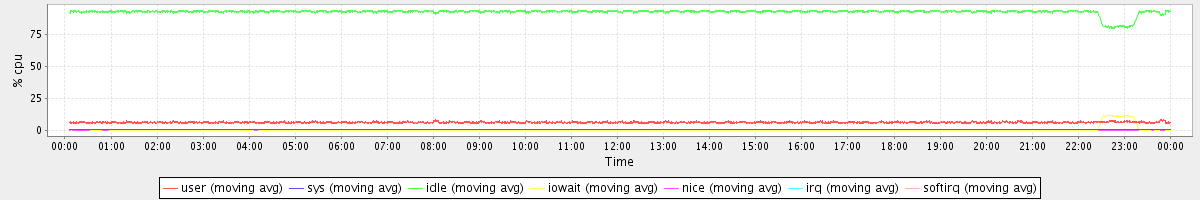 avg(user) = 6.28 avg(sys) = 0.56 avg(idle) = 92.70 avg(iowait) = 0.45 avg(nice) = 0.00 avg(irq) = 0.00 avg(softirq) = 0.00