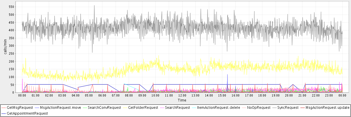 max(GetMsgRequest) = 62.00 max(MsgActionRequest.move) = 116.00 max(SearchConvRequest) = 40.00 max(GetFolderRequest) = 239.00 max(SearchRequest) = 88.00 max(ItemActionRequest.delete) = 58.00 max(NoOpRequest) = 67.00 max(SyncRequest) = 559.00 max(MsgActionRequest.update) = 46.00 max(GetAppointmentRequest) = 53.00