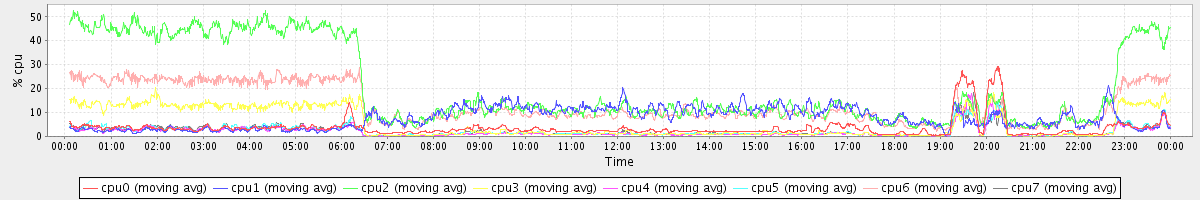 avg(cpu0) = 3.63 avg(cpu1) = 7.57 avg(cpu2) = 20.97 avg(cpu3) = 5.42 avg(cpu4) = 1.94 avg(cpu5) = 2.23 avg(cpu6) = 13.29 avg(cpu7) = 2.22