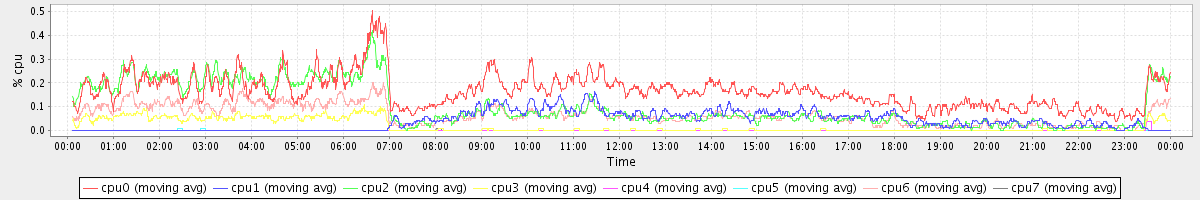 avg(cpu0) = 1.53 avg(cpu1) = 0.25 avg(cpu2) = 0.33 avg(cpu3) = 0.23 avg(cpu4) = 0.18 avg(cpu5) = 0.18 avg(cpu6) = 0.25 avg(cpu7) = 0.17