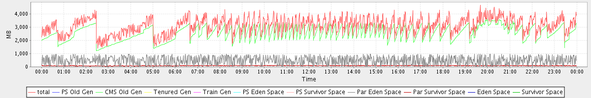 avg(total) = 3128.08 avg(PS Old Gen) = 0.00 avg(CMS Old Gen) = 2557.58 avg(Tenured Gen) = 0.00 avg(Train Gen) = 0.00 avg(PS Eden Space) = 0.00 avg(PS Survivor Space) = 0.00 avg(Par Eden Space) = 481.62 avg(Par Survivor Space) = 88.88 avg(Eden Space) = 0.00 avg(Survivor Space) = 0.00