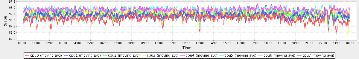 avg(cpu0) = 90.60 avg(cpu1) = 91.91 avg(cpu2) = 91.95 avg(cpu3) = 92.57 avg(cpu4) = 93.92 avg(cpu5) = 93.93 avg(cpu6) = 93.37 avg(cpu7) = 93.52