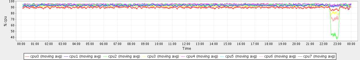 avg(cpu0) = 89.77 avg(cpu1) = 93.15 avg(cpu2) = 92.48 avg(cpu3) = 92.04 avg(cpu4) = 95.25 avg(cpu5) = 94.32 avg(cpu6) = 93.57 avg(cpu7) = 95.06
