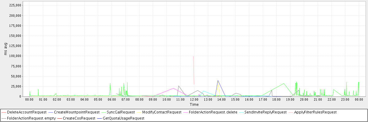 avg(DeleteAccountRequest) = 1474.00 avg(CreateMountpointRequest) = 5031.75 avg(SyncGalRequest) = 4119.28 avg(ModifyContactRequest) = 1228.69 avg(FolderActionRequest.delete) = 2328.08 avg(SendInviteReplyRequest) = 1116.45 avg(ApplyFilterRulesRequest) = 64256.00 avg(FolderActionRequest.empty) = 2093.07 avg(CreateCosRequest) = 224081.00 avg(GetQuotaUsageRequest) = 1162.00