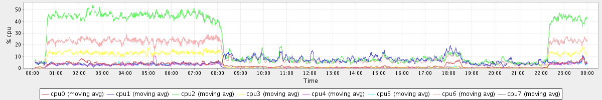 avg(cpu0) = 20.58 avg(cpu1) = 11.27 avg(cpu2) = 11.44 avg(cpu3) = 10.43 avg(cpu4) = 8.30 avg(cpu5) = 9.98 avg(cpu6) = 11.17 avg(cpu7) = 9.92