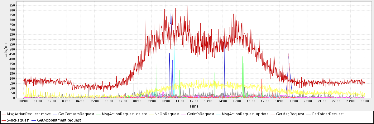 max(MsgActionRequest.move) = 196.00 max(GetContactsRequest) = 386.00 max(MsgActionRequest.delete) = 424.00 max(NoOpRequest) = 200.00 max(GetInfoRequest) = 103.00 max(MsgActionRequest.update) = 576.00 max(GetMsgRequest) = 466.00 max(GetFolderRequest) = 153.00 max(SyncRequest) = 945.00 max(GetAppointmentRequest) = 878.00