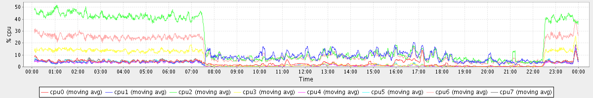avg(cpu0) = 1.64 avg(cpu1) = 0.22 avg(cpu2) = 0.31 avg(cpu3) = 0.19 avg(cpu4) = 0.14 avg(cpu5) = 0.15 avg(cpu6) = 0.23 avg(cpu7) = 0.17