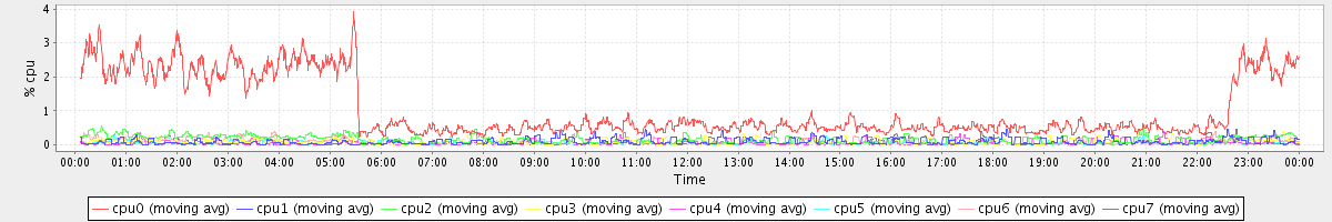 avg(cpu0) = 1.04 avg(cpu1) = 0.10 avg(cpu2) = 0.15 avg(cpu3) = 0.08 avg(cpu4) = 0.05 avg(cpu5) = 0.05 avg(cpu6) = 0.09 avg(cpu7) = 0.05