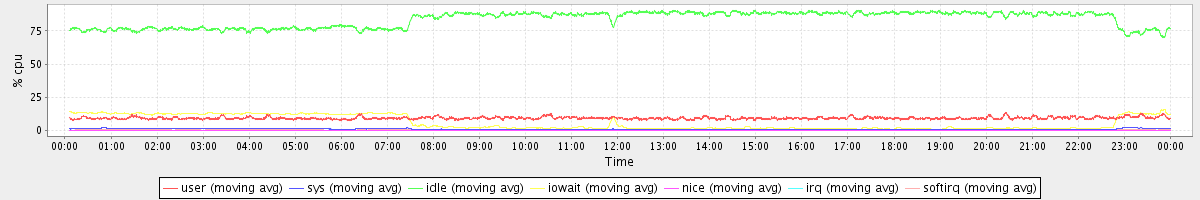avg(user) = 9.25 avg(sys) = 1.00 avg(idle) = 83.70 avg(iowait) = 5.77 avg(nice) = 0.00 avg(irq) = 0.03 avg(softirq) = 0.26