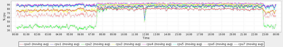 avg(cpu0) = 78.77 avg(cpu1) = 86.78 avg(cpu2) = 67.89 avg(cpu3) = 85.45 avg(cpu4) = 91.99 avg(cpu5) = 89.57 avg(cpu6) = 79.41 avg(cpu7) = 89.74