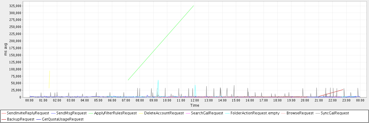 avg(SendInviteReplyRequest) = 568.75 avg(SendMsgRequest) = 798.15 avg(ApplyFilterRulesRequest) = 192998.50 avg(DeleteAccountRequest) = 63358.00 avg(SearchGalRequest) = 672.78 avg(FolderActionRequest.empty) = 2971.33 avg(BrowseRequest) = 864.00 avg(SyncGalRequest) = 3473.32 avg(BackupRequest) = 13831.00 avg(GetQuotaUsageRequest) = 1071.00