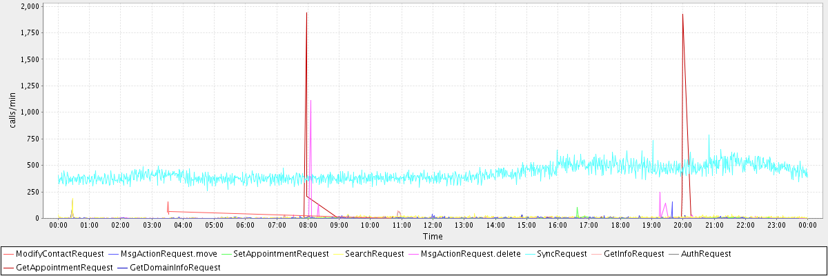 max(ModifyContactRequest) = 158.00 max(MsgActionRequest.move) = 157.00 max(SetAppointmentRequest) = 103.00 max(SearchRequest) = 188.00 max(MsgActionRequest.delete) = 1114.00 max(SyncRequest) = 790.00 max(GetInfoRequest) = 186.00 max(AuthRequest) = 185.00 max(GetAppointmentRequest) = 1936.00 max(GetDomainInfoRequest) = 184.00