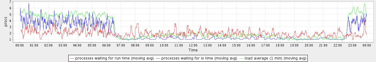 avg(processes waiting for run time) = 1.16 avg(processes waiting for io time) = 1.33 avg(load average (1 min)) = 2.63