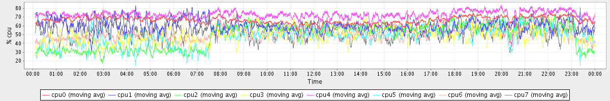avg(cpu0) = 66.54 avg(cpu1) = 60.25 avg(cpu2) = 48.89 avg(cpu3) = 49.57 avg(cpu4) = 72.77 avg(cpu5) = 47.54 avg(cpu6) = 51.02 avg(cpu7) = 53.38