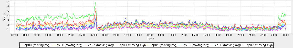 avg(cpu0) = 2.27 avg(cpu1) = 0.40 avg(cpu2) = 0.50 avg(cpu3) = 0.40 avg(cpu4) = 0.30 avg(cpu5) = 0.38 avg(cpu6) = 0.41 avg(cpu7) = 0.36