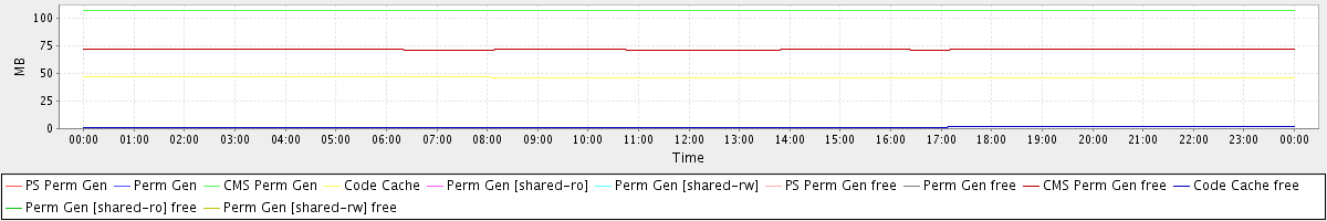 avg(PS Perm Gen) = 0.00 avg(Perm Gen) = 0.00 avg(CMS Perm Gen) = 107.12 avg(Code Cache) = 46.44 avg(Perm Gen [shared-ro]) = 0.00 avg(Perm Gen [shared-rw]) = 0.00 avg(PS Perm Gen free) = 0.00 avg(Perm Gen free) = 0.00 avg(CMS Perm Gen free) = 71.66 avg(Code Cache free) = 1.37 avg(Perm Gen [shared-ro] free) = 0.00 avg(Perm Gen [shared-rw] free) = 0.00