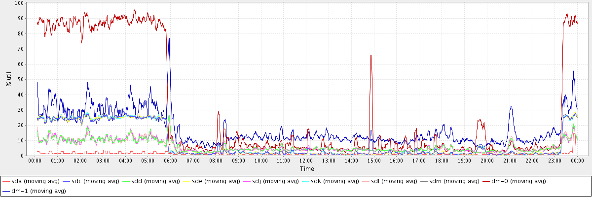 avg(sda) = 1.46 avg(sdc) = 8.17 avg(sdd) = 6.16 avg(sde) = 8.19 avg(sdj) = 6.14 avg(sdk) = 8.20 avg(sdl) = 6.19 avg(sdm) = 8.10 avg(dm-0) = 28.88 avg(dm-1) = 17.55