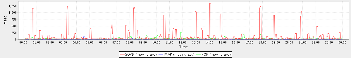 max(MsgActionRequest.move) = 38.00 max(SearchRequest) = 210.00 max(MsgActionRequest.delete) = 686.00 max(NoOpRequest) = 78.00 max(ConvActionRequest.trash) = 87.00 max(MsgActionRequest.update) = 45.00 max(SearchConvRequest) = 37.00 max(GetFolderRequest) = 46.00 max(SyncRequest) = 608.00 max(GetAppointmentRequest) = 661.00