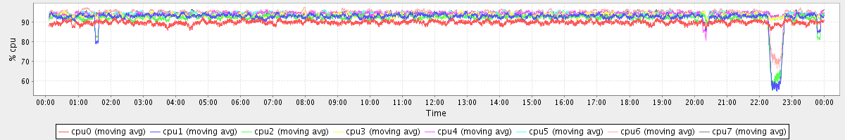 avg(cpu0) = 89.94 avg(cpu1) = 92.50 avg(cpu2) = 91.96 avg(cpu3) = 93.45 avg(cpu4) = 94.13 avg(cpu5) = 94.23 avg(cpu6) = 94.72 avg(cpu7) = 94.37