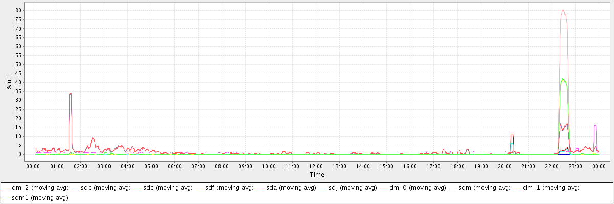 avg(dm-2) = 1.39 avg(sde) = 1.38 avg(sdc) = 0.69 avg(sdf) = 0.69 avg(sda) = 1.14 avg(sdj) = 0.06 avg(dm-0) = 1.32 avg(sdm) = 0.06 avg(dm-1) = 0.10 avg(sdm1) = 0.00