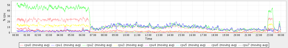 avg(cpu0) = 2.84 avg(cpu1) = 7.64 avg(cpu2) = 19.97 avg(cpu3) = 4.64 avg(cpu4) = 1.40 avg(cpu5) = 1.63 avg(cpu6) = 12.42 avg(cpu7) = 1.61