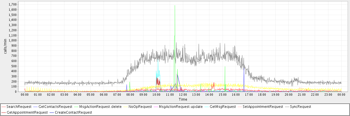 avg(SendMsgRequest) = 792.85 avg(SyncGalRequest) = 3709.61 avg(SendInviteReplyRequest) = 1000.98 avg(RemoveAttachmentsRequest) = 519.60 avg(ApplyFilterRulesRequest) = 51351.00 avg(ConvActionRequest.delete) = 758.06 avg(SearchGalRequest) = 582.55 avg(FolderActionRequest.empty) = 2284.86 avg(BackupRequest) = 19241.50 avg(GetQuotaUsageRequest) = 1106.00