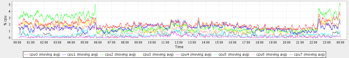 avg(cpu0) = 3.64 avg(cpu1) = 6.01 avg(cpu2) = 15.70 avg(cpu3) = 5.45 avg(cpu4) = 0.05 avg(cpu5) = 0.72 avg(cpu6) = 8.27 avg(cpu7) = 0.68