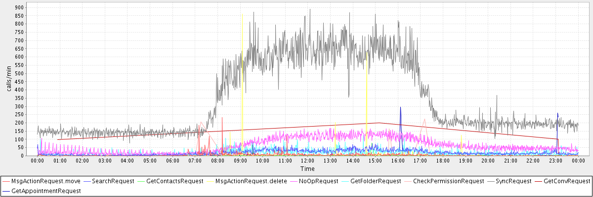 avg(FolderActionRequest.sync) = 10056.00 avg(SendMsgRequest) = 897.58 avg(SyncGalRequest) = 3567.83 avg(CheckRecurConflictsRequest) = 5936.69 avg(SendInviteReplyRequest) = 929.86 avg(ApplyFilterRulesRequest) = 814.00 avg(ConvActionRequest.delete) = 1093.36 avg(FolderActionRequest.empty) = 3316.45 avg(BackupRequest) = 19593.50 avg(GetQuotaUsageRequest) = 1158.00