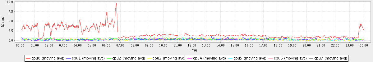 avg(cpu0) = 1.85 avg(cpu1) = 0.23 avg(cpu2) = 0.30 avg(cpu3) = 0.20 avg(cpu4) = 0.15 avg(cpu5) = 0.14 avg(cpu6) = 0.22 avg(cpu7) = 0.16