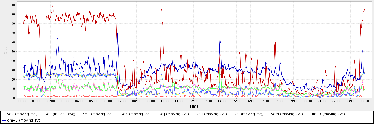 avg(sda) = 1.73 avg(sdc) = 10.41 avg(sdd) = 9.54 avg(sde) = 10.52 avg(sdj) = 9.55 avg(sdk) = 10.50 avg(sdl) = 9.54 avg(sdm) = 10.45 avg(dm-0) = 37.41 avg(dm-1) = 27.27